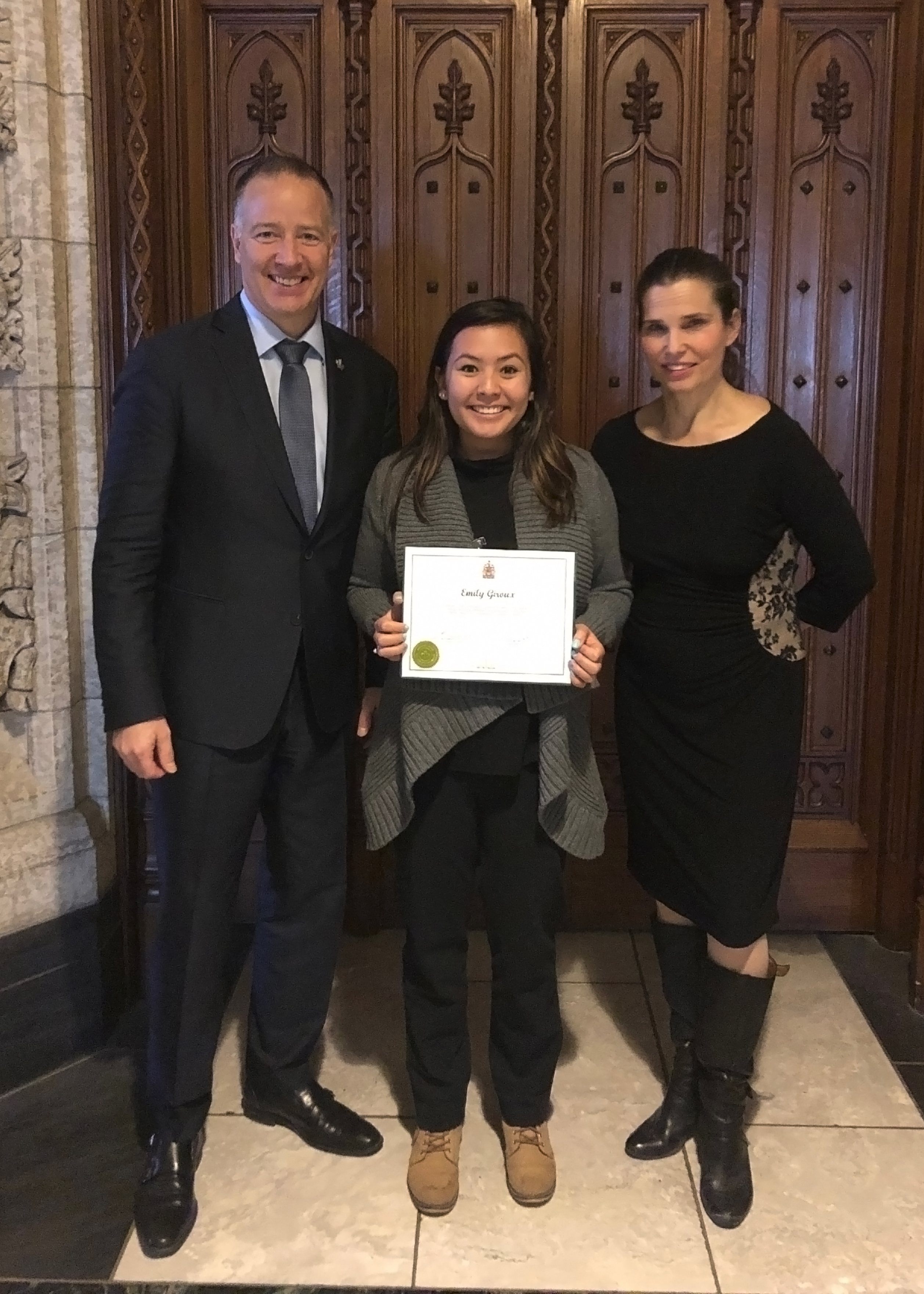 Below: Emily Giroux's award-winning research was recognized by the Honourable Kirsty Duncan and MP Stephen Fuhr at Parliament Hill